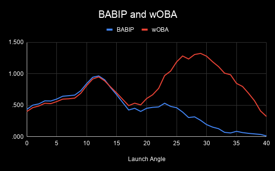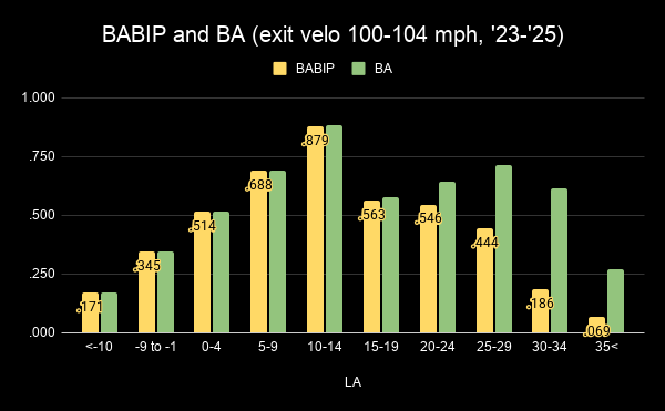 Let’s isolate that 100-104 mph mark so we are sure we are minimizing noise, and compare BABIPs on launch angle instead: