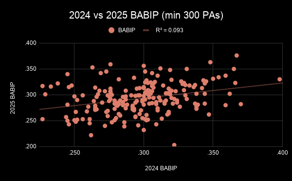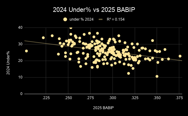 Oh goodness, an r^2 over .500, how lovely. Yep, it holds pretty dang well. This is actually fantastic news because Line Drive rate is notoriously not sticky, and of course, BABIP isn’t. The next step, then, is to combine the stickiness of Under% with year-to-year BABIP. In other words, among players with 300 PAs in both 2024 and 2025, what was the correlation between their 2024 Under% and their 2025 BABIP?