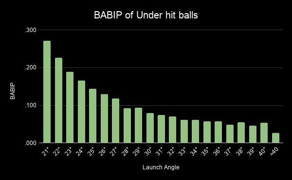 Yeah, I could have logged 41-52 or 41-90, but you get the idea. 21 and 22 degree Under hit balls happen so rarely that even their comparatively high BABIPs don’t skew the results.