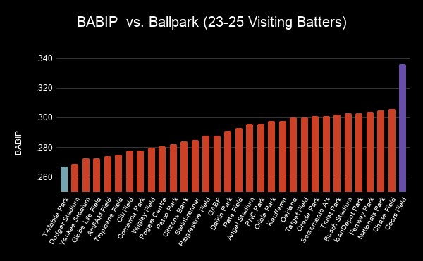 This graph illustrates why I find BABIP so particularly fascinating: its correlation with good hitting is… mixed. Sure, high BABIP means more hits, which means more runs, as we went over in part one (although you probably didn’t need a whole article to read it – still should, though). However, when discussing hitters, BABIP has many other factors that create variance. Let’s bring back this graph on ballparks.