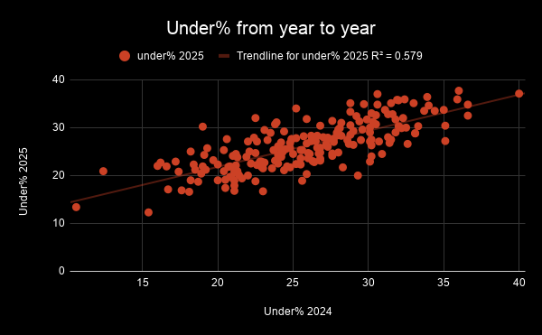 That’s a .25 r^2 exactly. Now, while this is all well and good, as we established earlier, BABIP is a weird stat that only barely matters from year to year. Despite the commonly cited “career norms” point, it doesn’t have all that much to do with a player’s BABIP the following year. So let’s look at how sticky under% is: