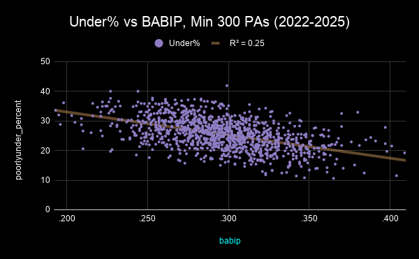 A batted ball in the under range has a BABIP of .057, going back to 2015. These batted balls suck. They are the type of batted ball that is only really useful if you’re totally pulling it down the line or hitting it for sac fly purposes – which wouldn’t count in BABIP anyway. Because of how terrible this result is, it stands to reason that the ability for a batter to avoid the can of corn fly ball is paramount for delivering on high BABIPs. Here’s every qualified hitter in baseball, looking at their under% and BABIP in 2025: