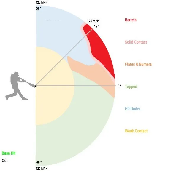 The true definition of statcast under% is a bit convoluted. The exact formula varies year to year, but this post from 2017 gives the gist. The formula is: Exit Velocity + 2 (Launch Angle) ≥ 116, with a few additional qualifiers, such as the launch angle needing to be at least 21 degrees, and not overlap with barrels, flares/burners, or poorly hit balls. You may be familiar with this statcast batted ball chart: