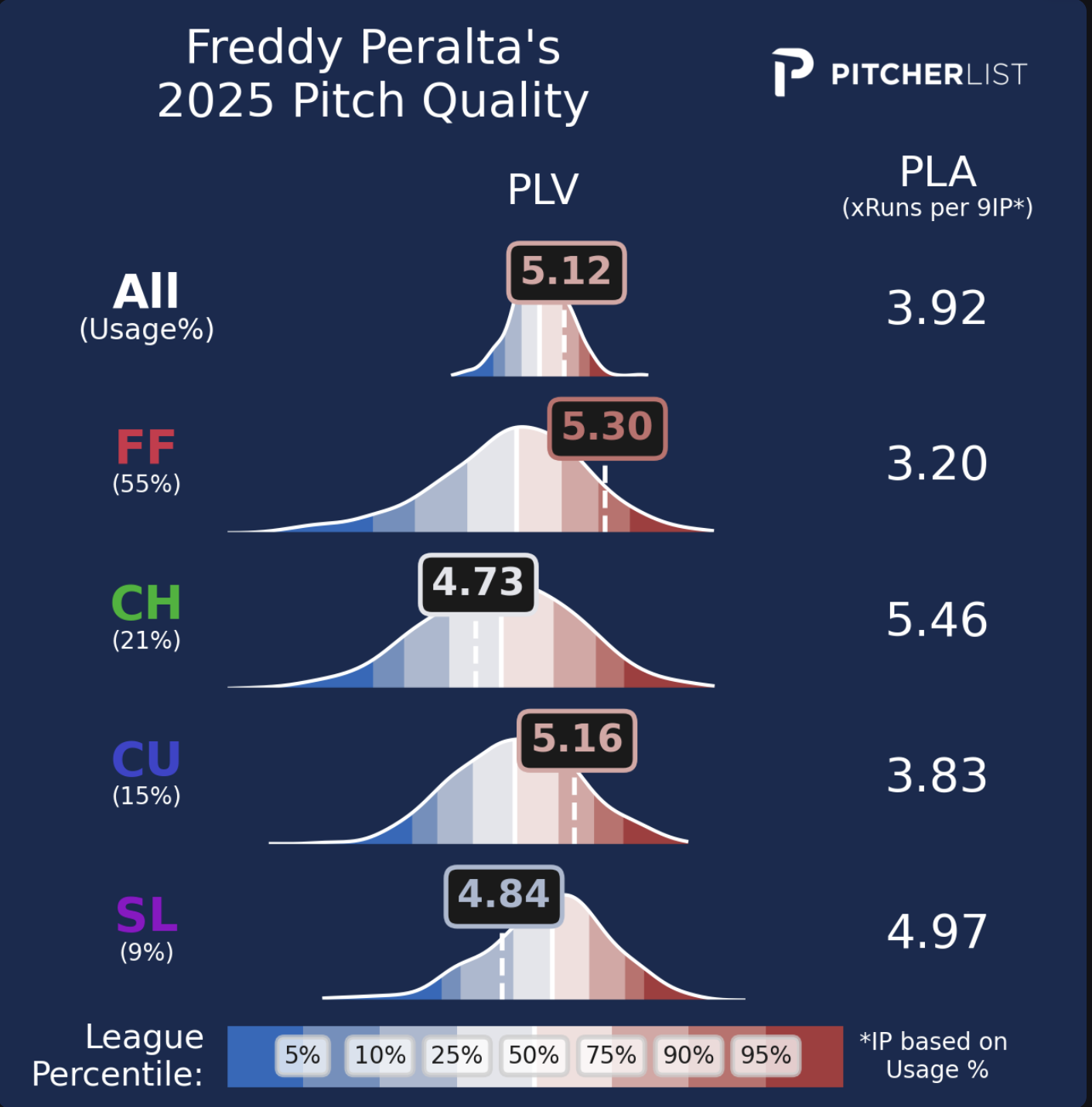 Peralta rounds out his arsenal with a changeup that doesn’t grade out the best, a solid curveball, and a slider that is below-average per PLV. The interesting thing about Peralta is that he’s basically shelved that slider after it was his main secondary for a while. Unfortunately, the pitch has lost a bit of movement which has led to PLV grading it worse, and as we have seen, Peralta and his pitching coaches believe that it should no longer be one of the main pieces to the puzzle that is his arsenal.