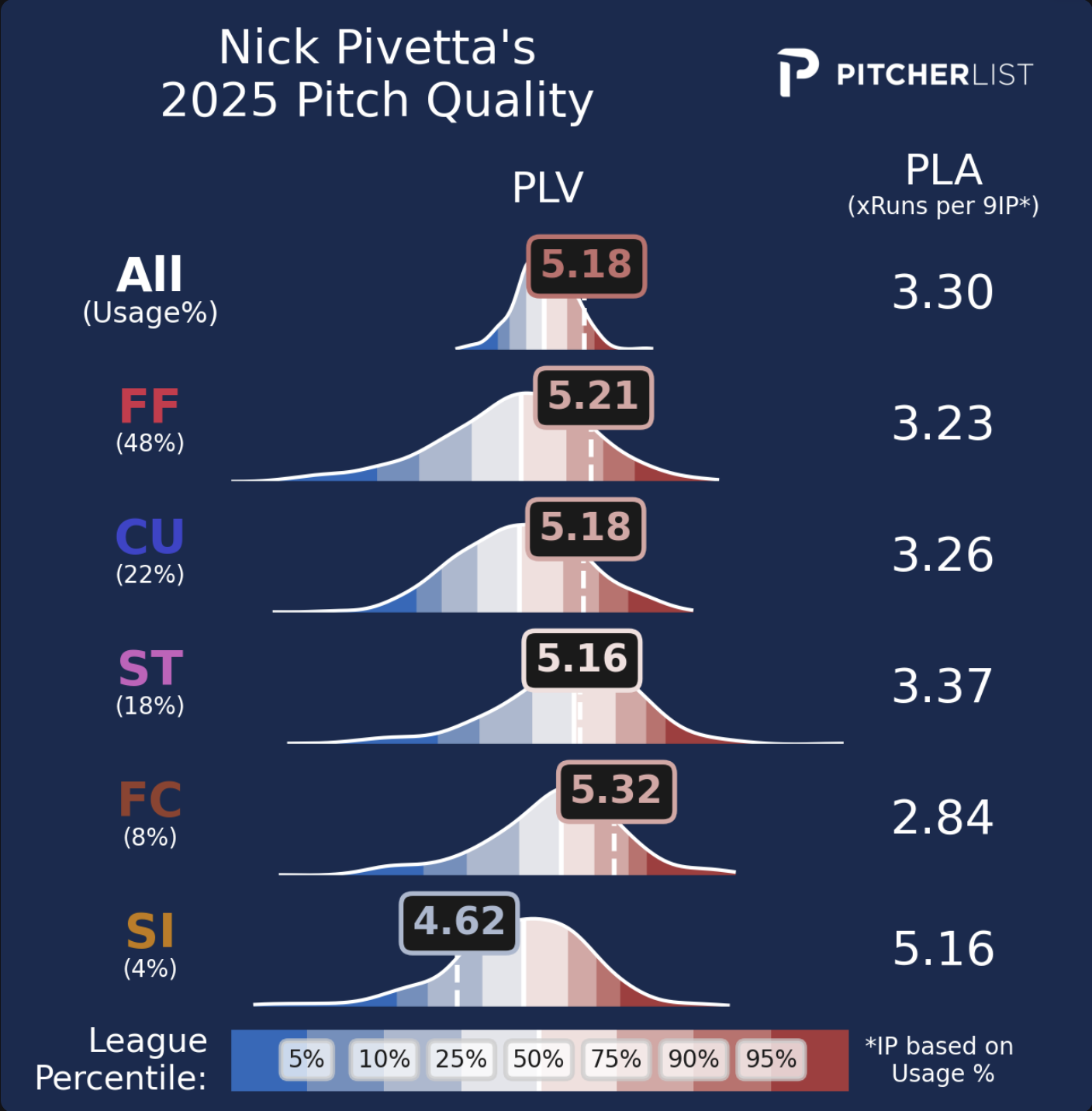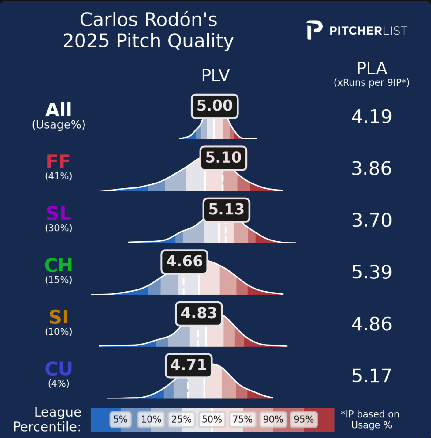 PLA is an ERA estimator that was created in tandem with Pitch Level Value, which we refer to as PLV. PLV is essentially an all-encompassing stat that measures individual pitches and rates them on a 0-10 scale. The elements that factor into PLV include velocity, movement, release point, location, count, and handedness of the batter. We have an excellent primer on this by the one and only Nick Pollack that you can find right here! PLA takes this 0-10 score and translates it to an estimated ERA, which makes it easier to understand and more useful for those looking for help with their fantasy teams.