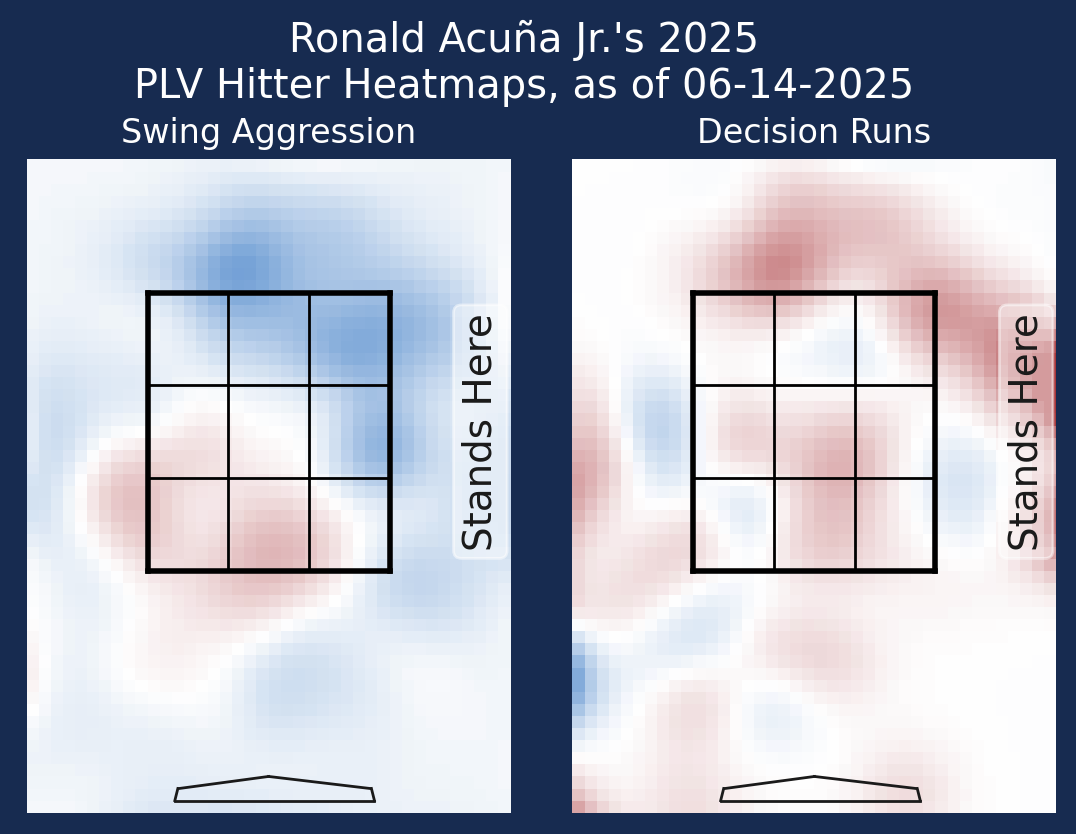 The production has once again been off the charts, but it’s even more fun that the underlying data supports what he’s been doing. His 128 Decision Value was the third best in baseball last month, and unlike the two names above him, he’s succeeding both in and out of the strike zone. Acuña’s 120 zDV and 119 oDV were both the sixth-best marks in the bigs. Here’s a look at how his Decision Value grades out visually: