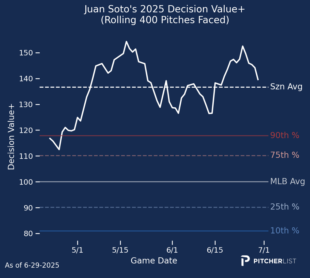 Here’s a look at Soto’s rolling Decision Value so far this year. You can see that early-season lull was still significantly better than the average hitter, and now he’s up to his typical elite level of production.