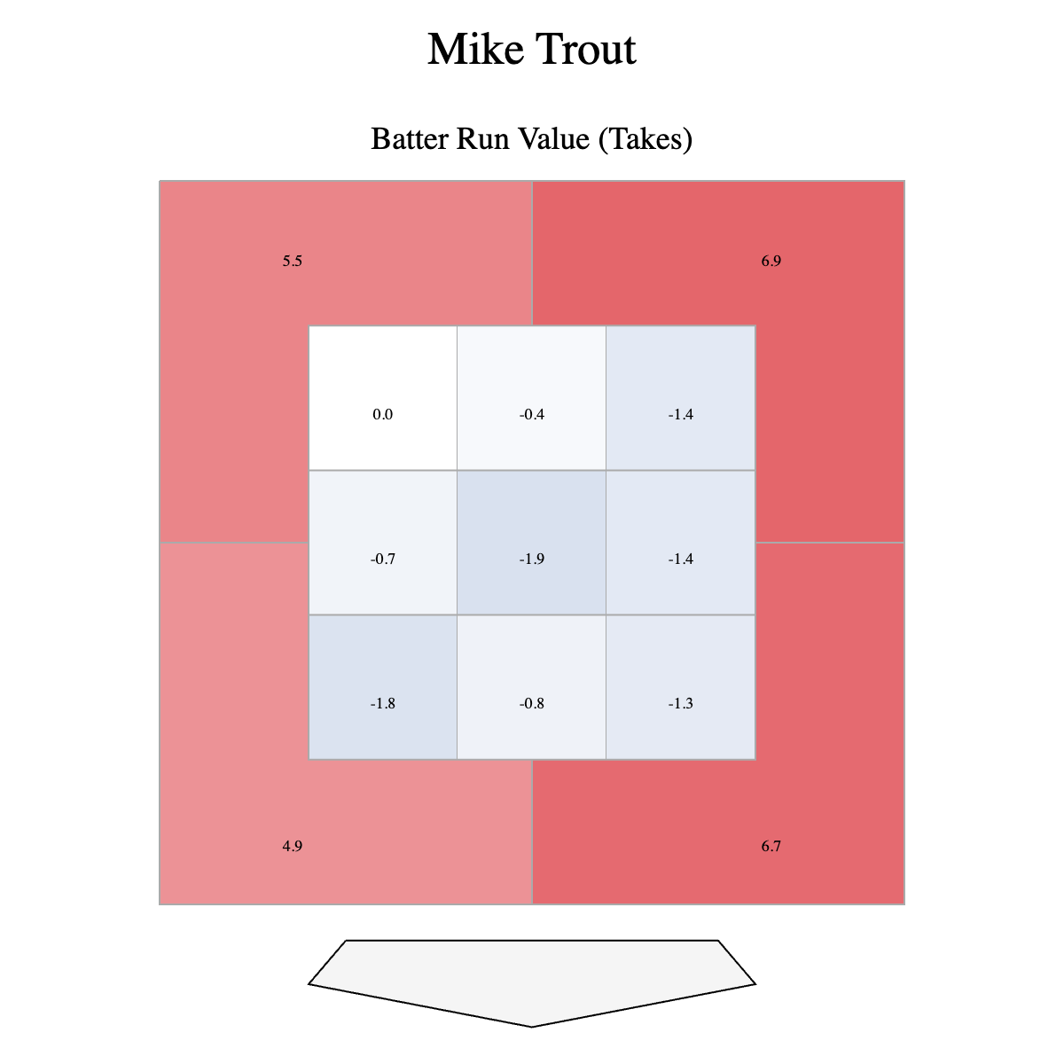 Here’s a great look at Trout’s Statcast Run Value on pitches he doesn’t swing at, broken down by zone. It’s a great visual representation of that idea.