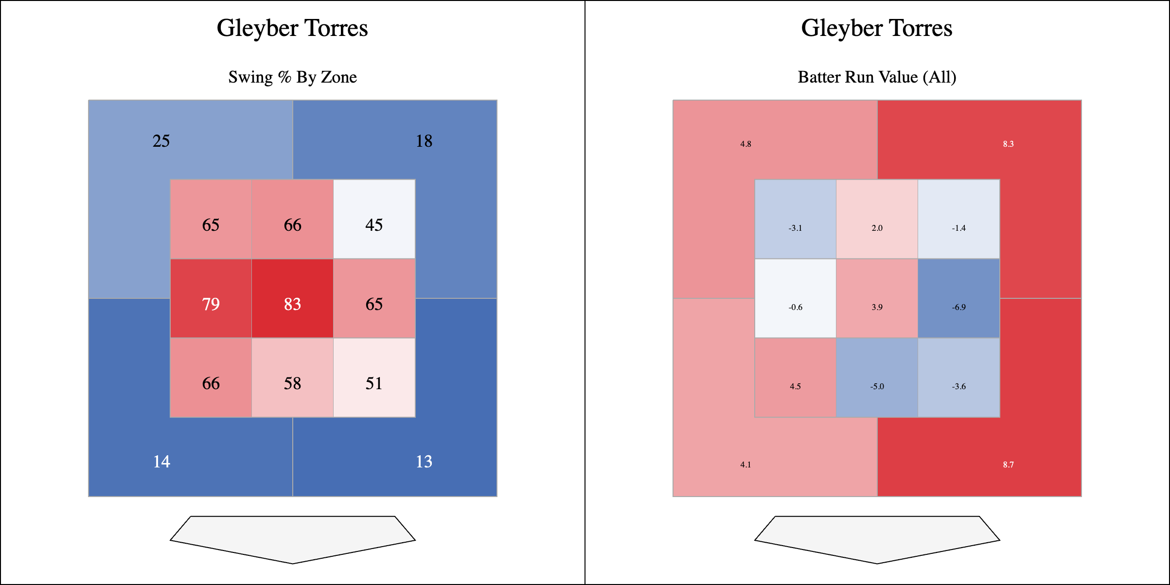Here’s a good look at Torres’ swing% and his Statcast Run Value broken down by zone.