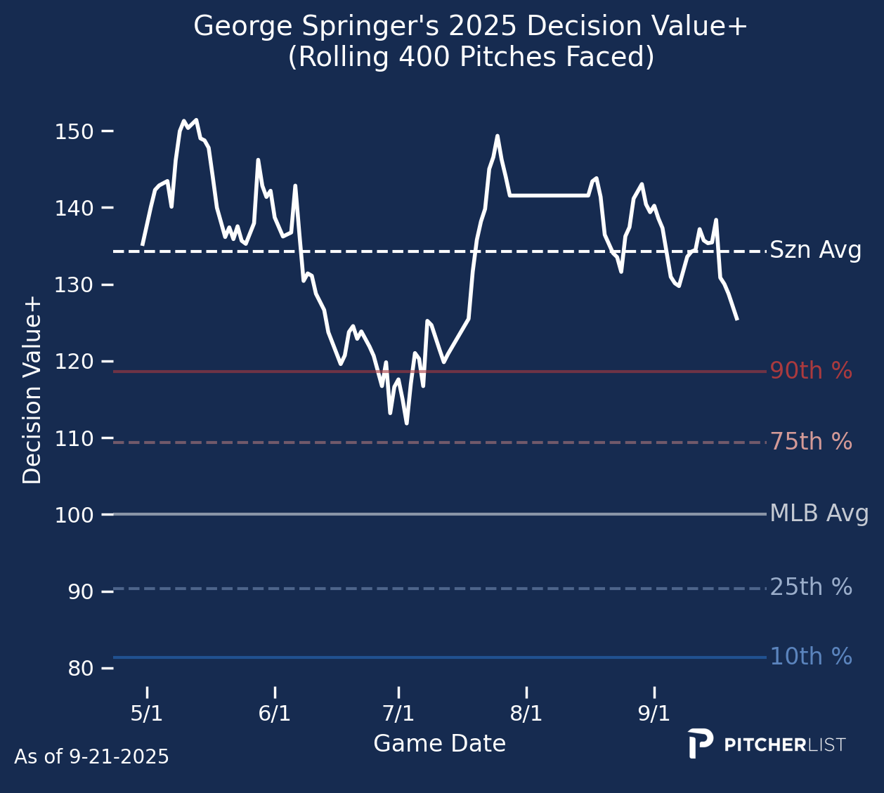It’s not just the typical stats that we’re seeing career-best output from the 36-year-old, though. He’s also making the best swing decisions we’ve ever seen from him. We have PLV data for full seasons dating back to 2021, and in every year we have data for, Springer’s only improved. He started by posting a 110 Decision Value during his first campaign as a Blue Jay in 2021, and has moved that mark up annually to 115, 116, 125, and now 133, the second-highest mark in baseball among hitters who’ve seen at least 500 pitches.