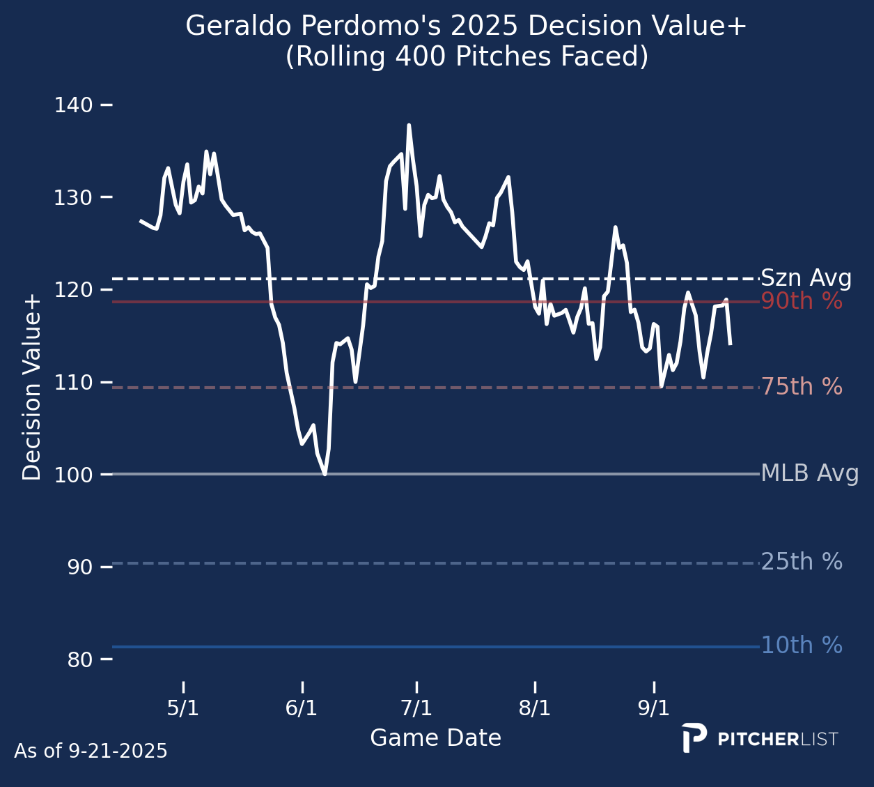 PLV has always viewed Perdomo as a good swing decision maker. He posted Decision Values between 113 and 117 in each of his first three seasons, but has upped that number to 121 in his breakout campaign.