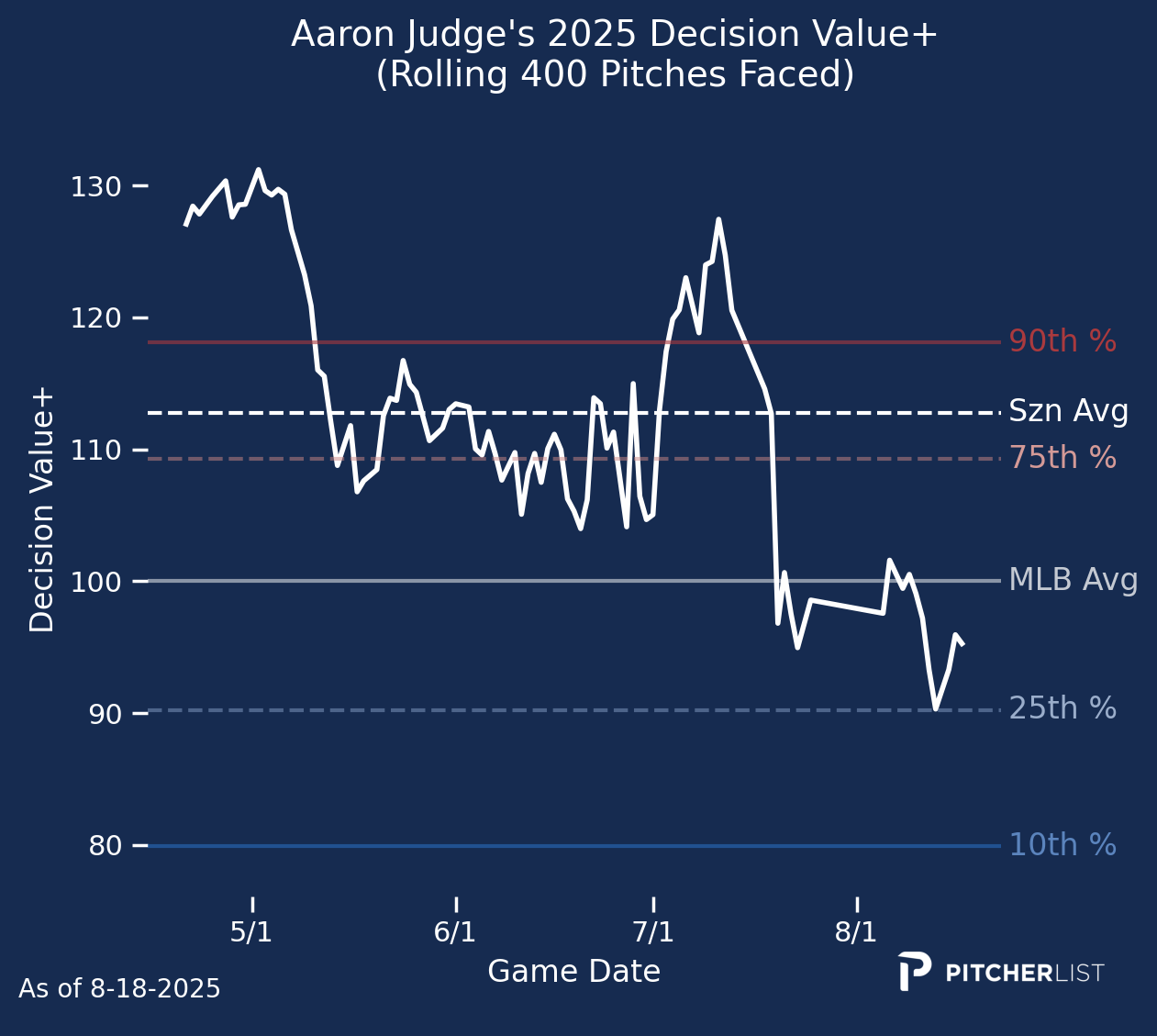 We’ll close things out by analyzing the best hitter in the sport. Judge does just about everything well, and his swing decisions are no exception. His 112 Decision Value is actually a significant step back from where he’s been the last several years. Beginning in 2022, he posted marks of 127, 129, and 131, but despite the downturn in swing decisions in 2025, he hasn’t missed a step at the plate. The Yankees’ captain is slashing a ridiculous .330/.445/.684 with 40 home runs and a 199 wRC+.