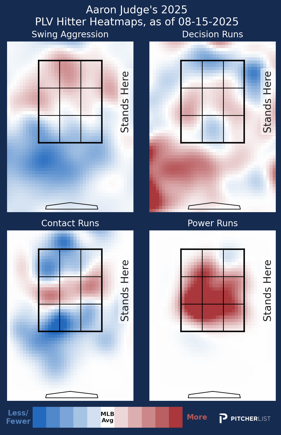 Here are Judge’s PLV heatmaps for the season. You can see that from a Decision Value standpoint, he’s good just about everywhere in the zone except the bottom middle and very top edge.