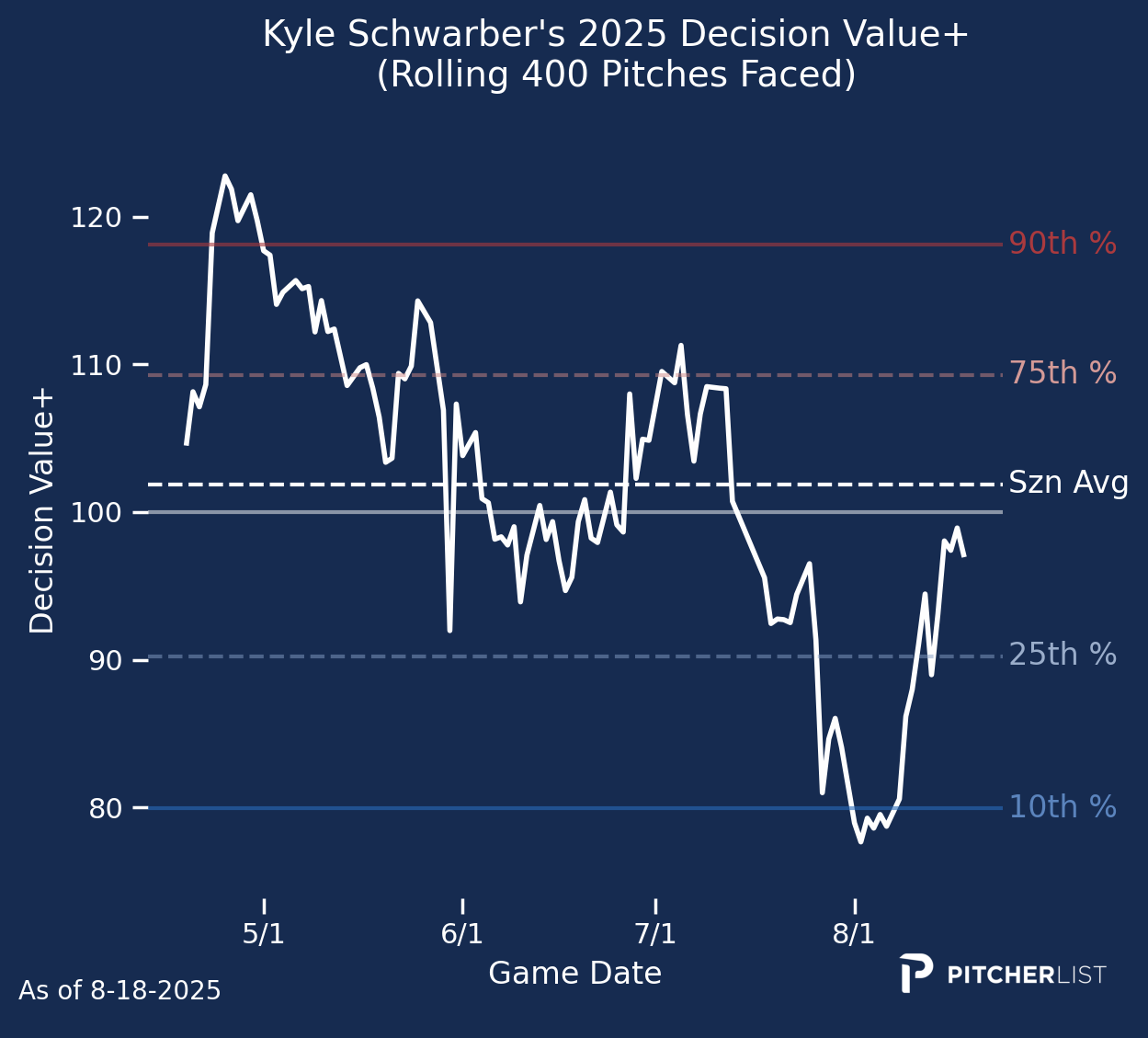 The power has been plentiful in the second half, but it’s come with a Decision Value swoon. Just about when the calendar flipped to July, Schwarber started making worse swing choices. If it weren’t for that decline, we’d likely be looking at a fifth consecutive season with Schwarber posting a Decision Value in the 110-115 range.