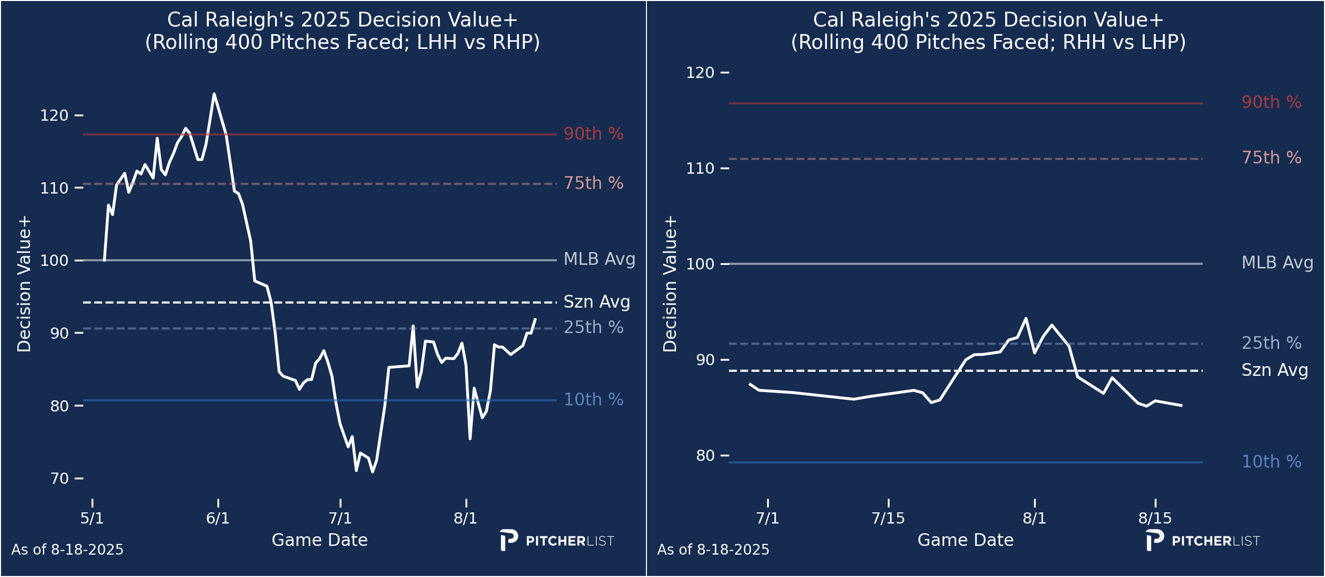As a switch hitter, it’s worth taking a look at Raleigh’s approach from each side of the plate to see if there are any noticeable differences. Here’s a look at his rolling Decision Value charts from both sides of the plate.