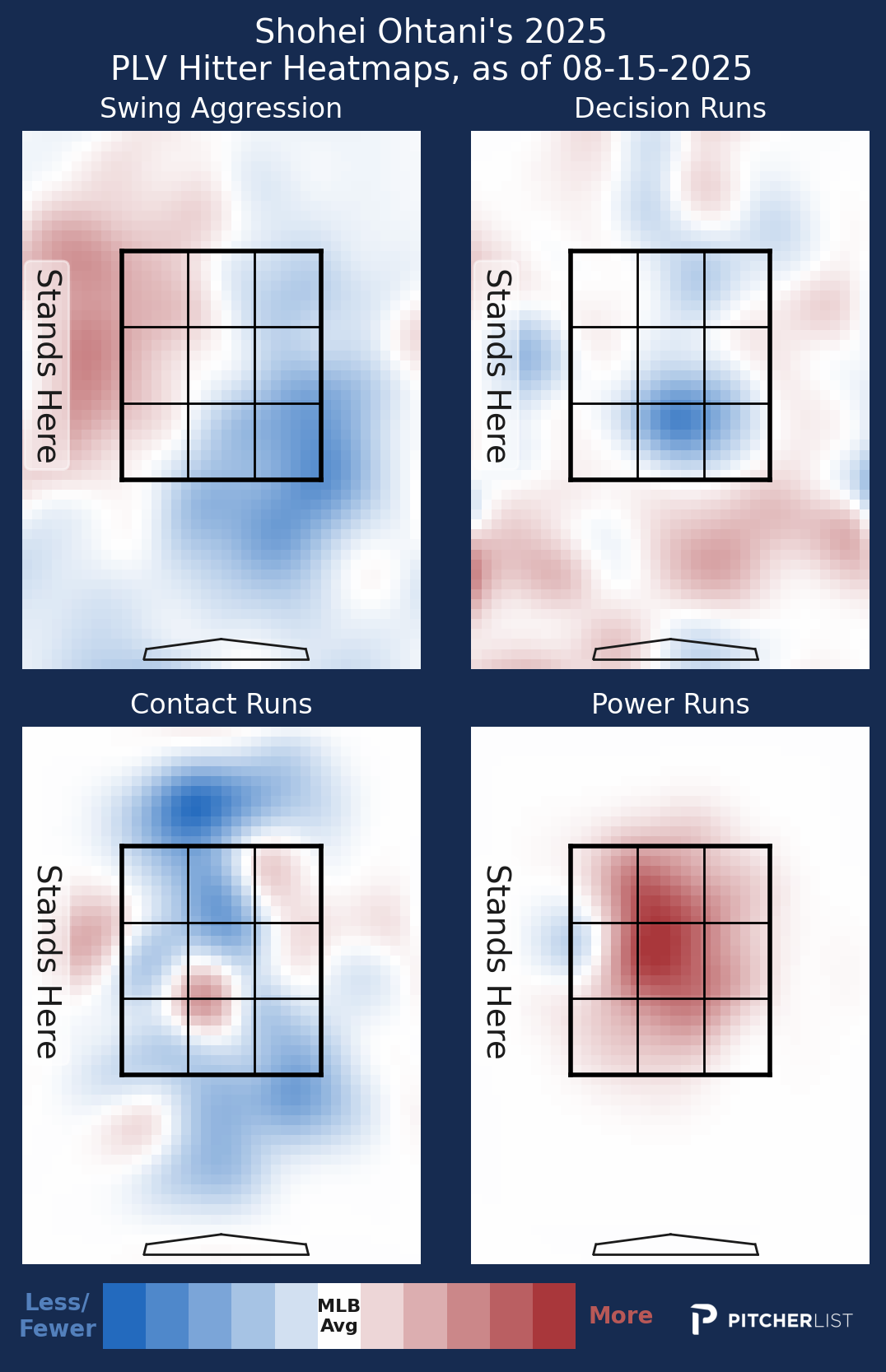 Delving a bit deeper, if we look at Ohtani’s PLV heatmaps, we can see a good breakdown of where he makes good and bad swing decisions. Take a look at his Decision Runs chart in the upper right of the image below.