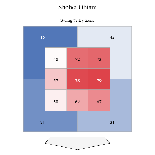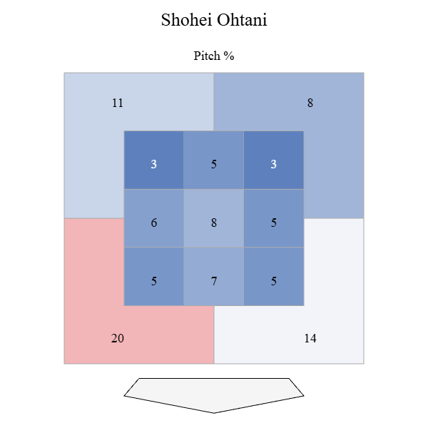 If you’re wondering why more pitchers don’t exclusively attack him in that area, it’s simple: it’s really hard to paint a specific location so precisely. If you aim for that low and away corner, you have a good chance you’re either going to leave something in the middle of the plate, which Ohtani is going to destroy, or you’ll just waste a pitch off the plate. Ohtani’s pitch% chart shows just that.