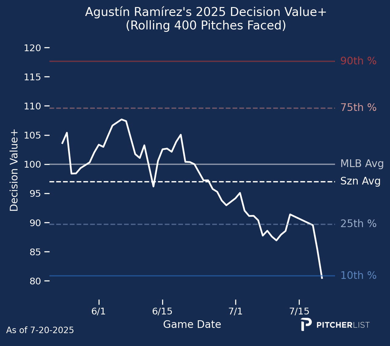 Baseball is a game of adjustments, and it looks like Ramírez has one to make if he wants to get back to being an above-average decision maker at the dish. Although he’s been able to maintain his production while the Decision Value has slipped – he has a 100 wRC+ since June 15th – there could be another level to unlock if the Marlins’ rookie backstop can improve his pitch recognition.