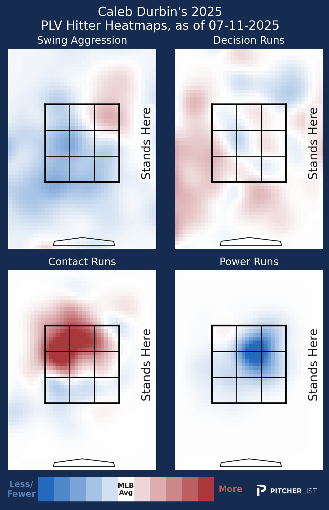 Durbin, like Collins, has been good at laying off pitches that land outside of the strike zone. He has a 111 oDV, which is aided by his general swing passivity. Durbin ranks in just the 20th percentile in swing rate, and he pairs that with great bat-to-ball skills. Both his contact (86.1%) and whiff rates (13.9%) are better than all but 5 percent of hitters.