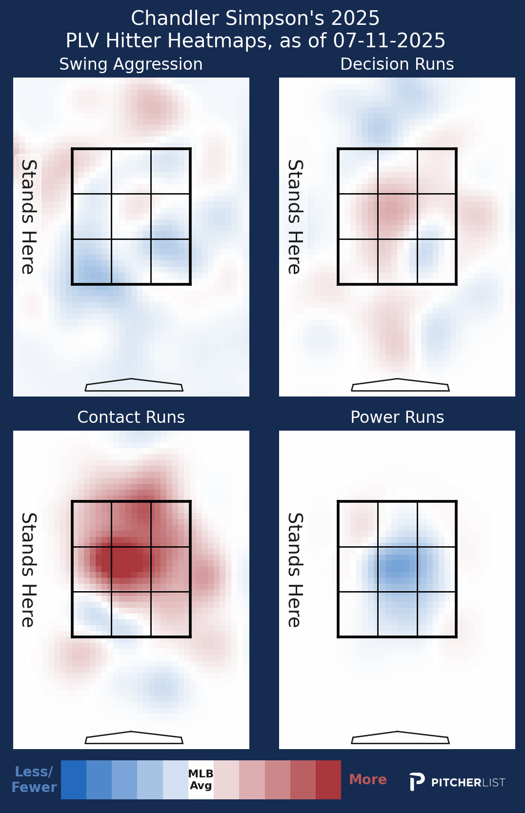 With that kind of profile, it’s paramount that Simpson make good swing decisions. He can’t regularly offer at bad pitches knowing that every now and then he’ll run into one and generate value via the long ball. He has to stay disciplined in the box, attack good pitches to hit, and spray the ball all over the field.