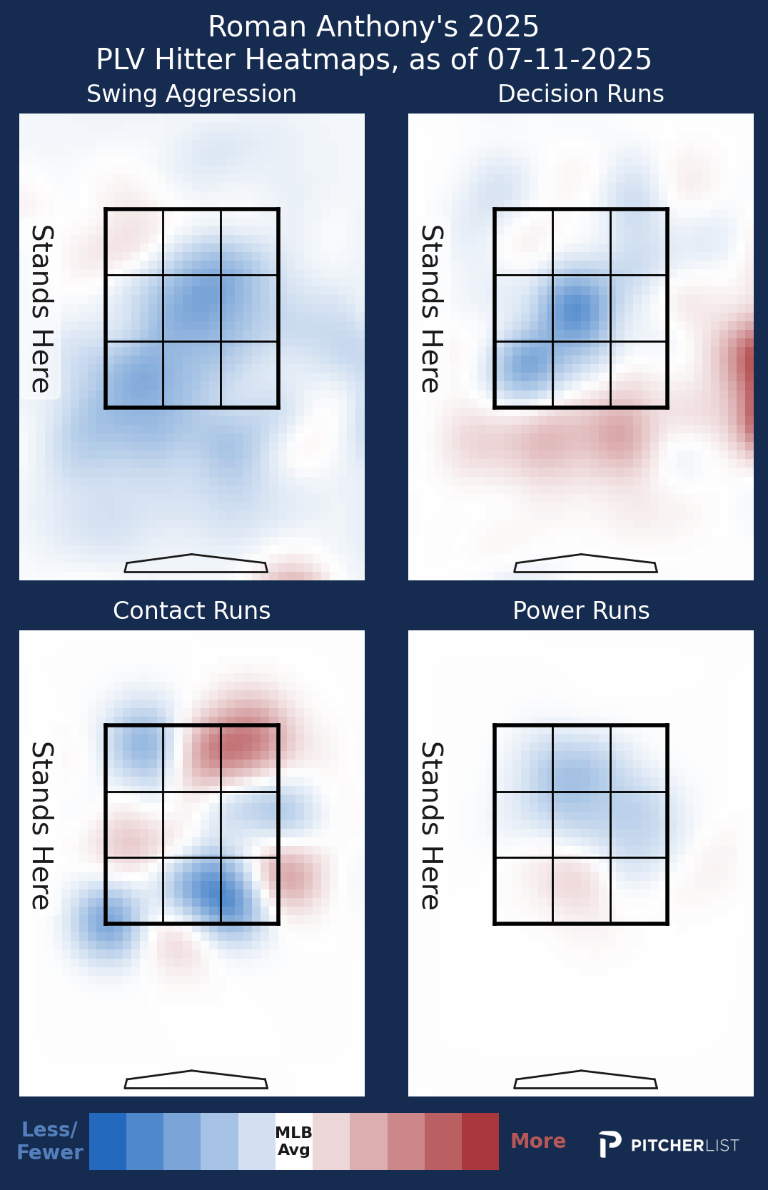 The reason for the giant gap is actually rather simple. Anthony doesn’t swing much. He offers at just 38.3% of the pitches he sees, a rate that falls in the 2nd percentile of big-league bats. Anthony’s patience at the plate may be a response to pitchers just not attacking him much. You’d think MLB arms would be happy to attack the youngest player in the AL, but only 46% of the offerings he’s seen have been in the zone. Anthony’s extreme propensity to keep the bat on his shoulder is nearly equal in and out of the strike zone, and that’s what’s creating the polarizing zDV and oDV numbers. PLV loves that he watches out-of-zone pitches go by, but it’s severely downgrading him for taking hittable pitches in the zone. His 21.2% called strike rate is higher than all but six percent of batters, and you have to wonder if he’ll turn the aggression up just a bit as he continues to adjust at the game’s highest level.