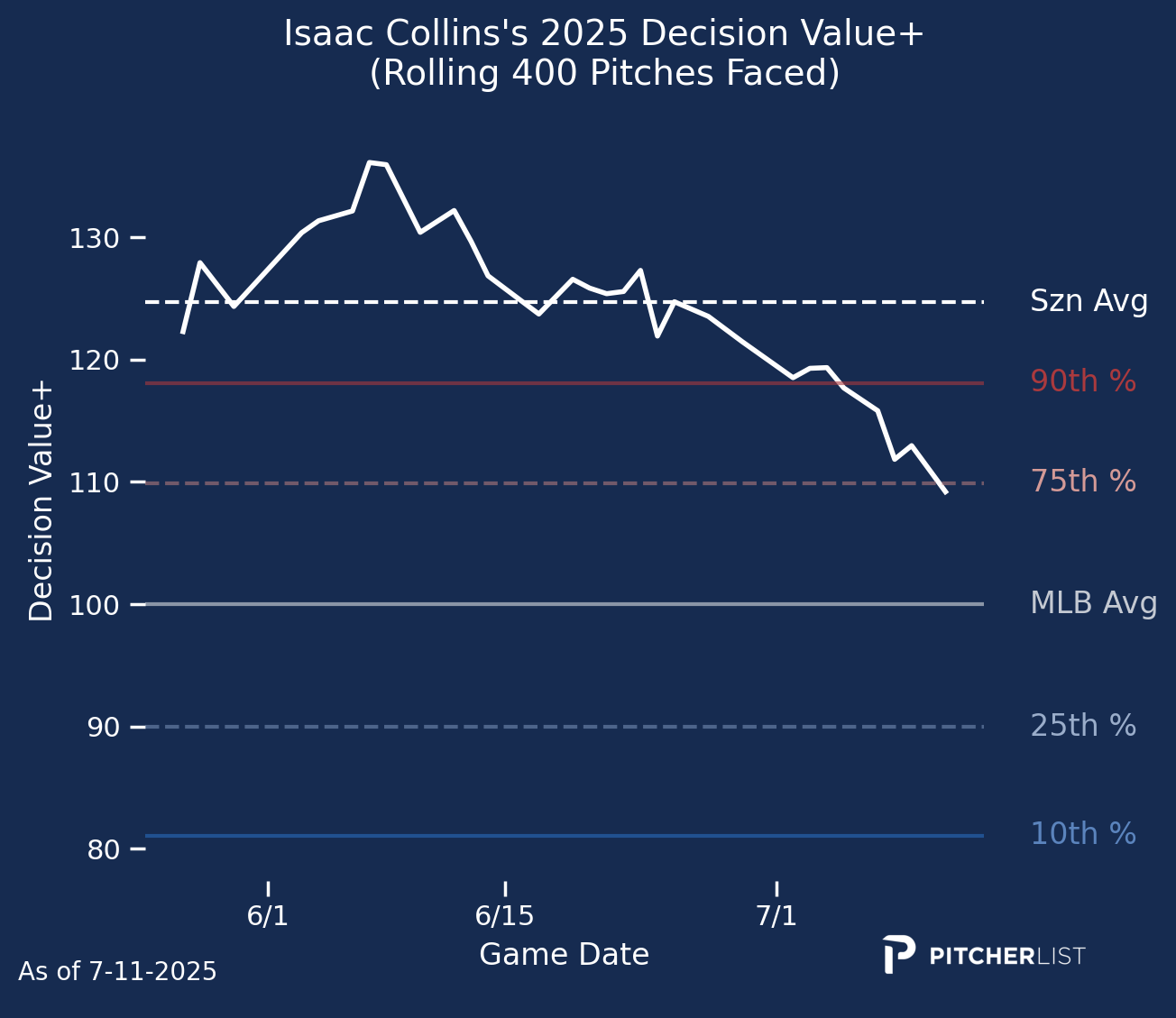 Here’s a look at Collins’ Decision Value over the course of the first half. The recent drop is notable, but he started at such a high mark that even with the decline, he’s still well above average. He’ll be one to watch in the second half to see if he can adjust and return to that elite level of decision-making in the batter’s box.
