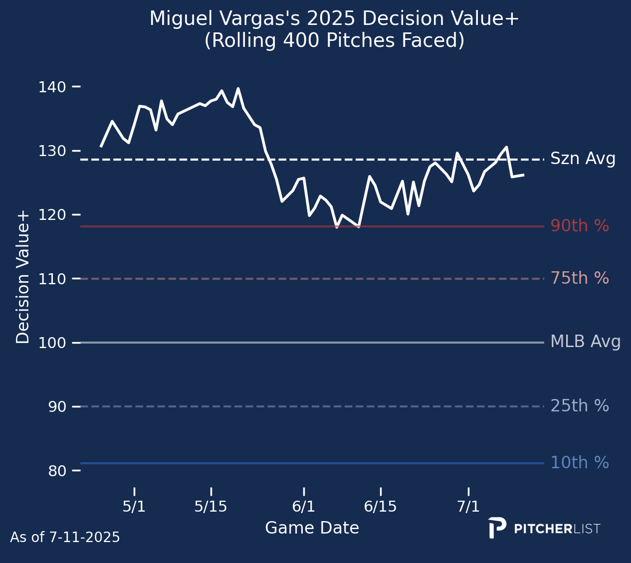 Vargas isn’t the only one making good swing decisions in Chicago. Mike Tauchman and Josh Rojas are two veterans also attacking good pitches to hit, and are candidates to be dealt at the deadline. Among their young building blocks, Chase Meidroth (114) and Kyle Teel (111) are both nearly a full standard deviation better than the average player in Decision Value and represent the start of what will hopefully be a quick rebuild in the Windy City.