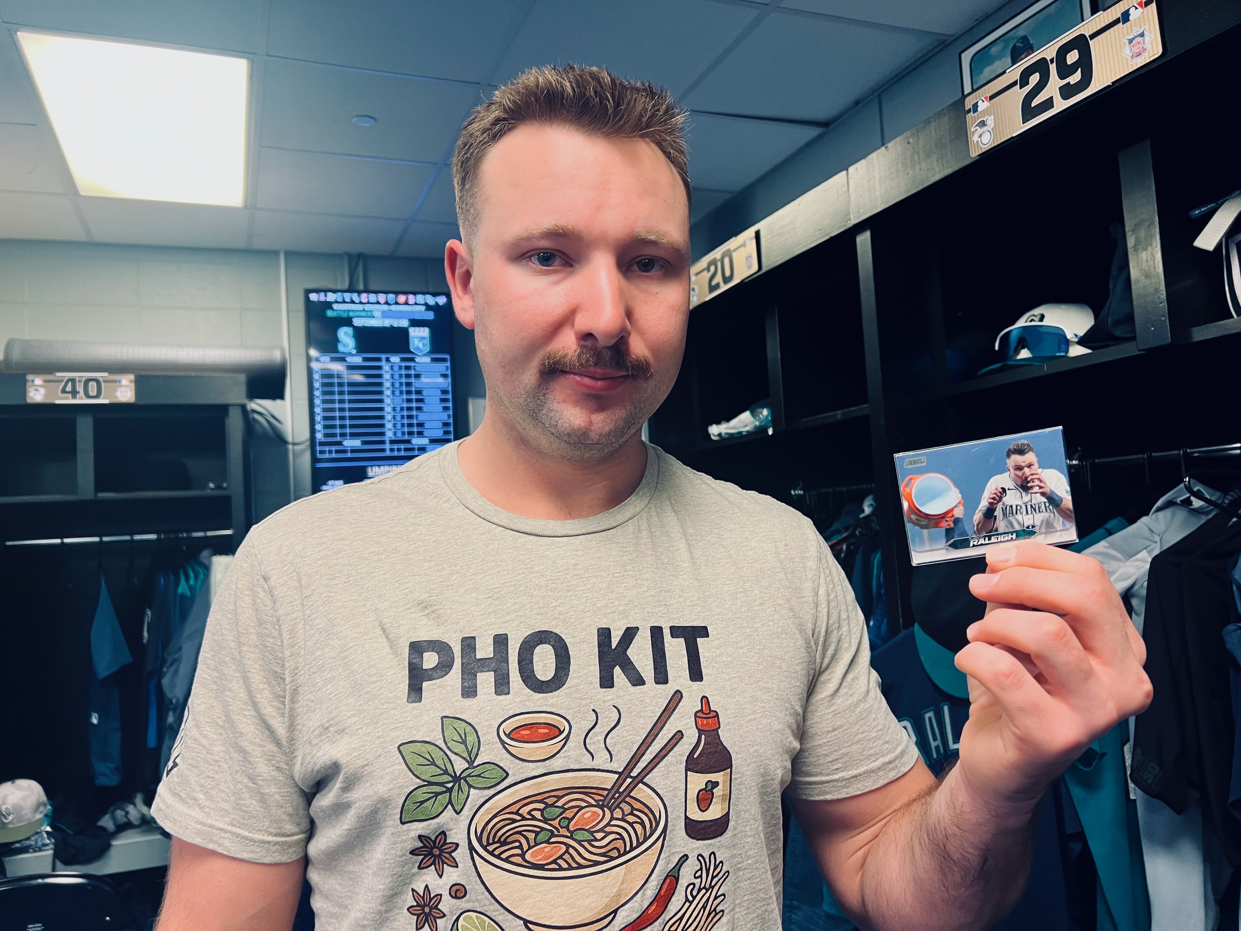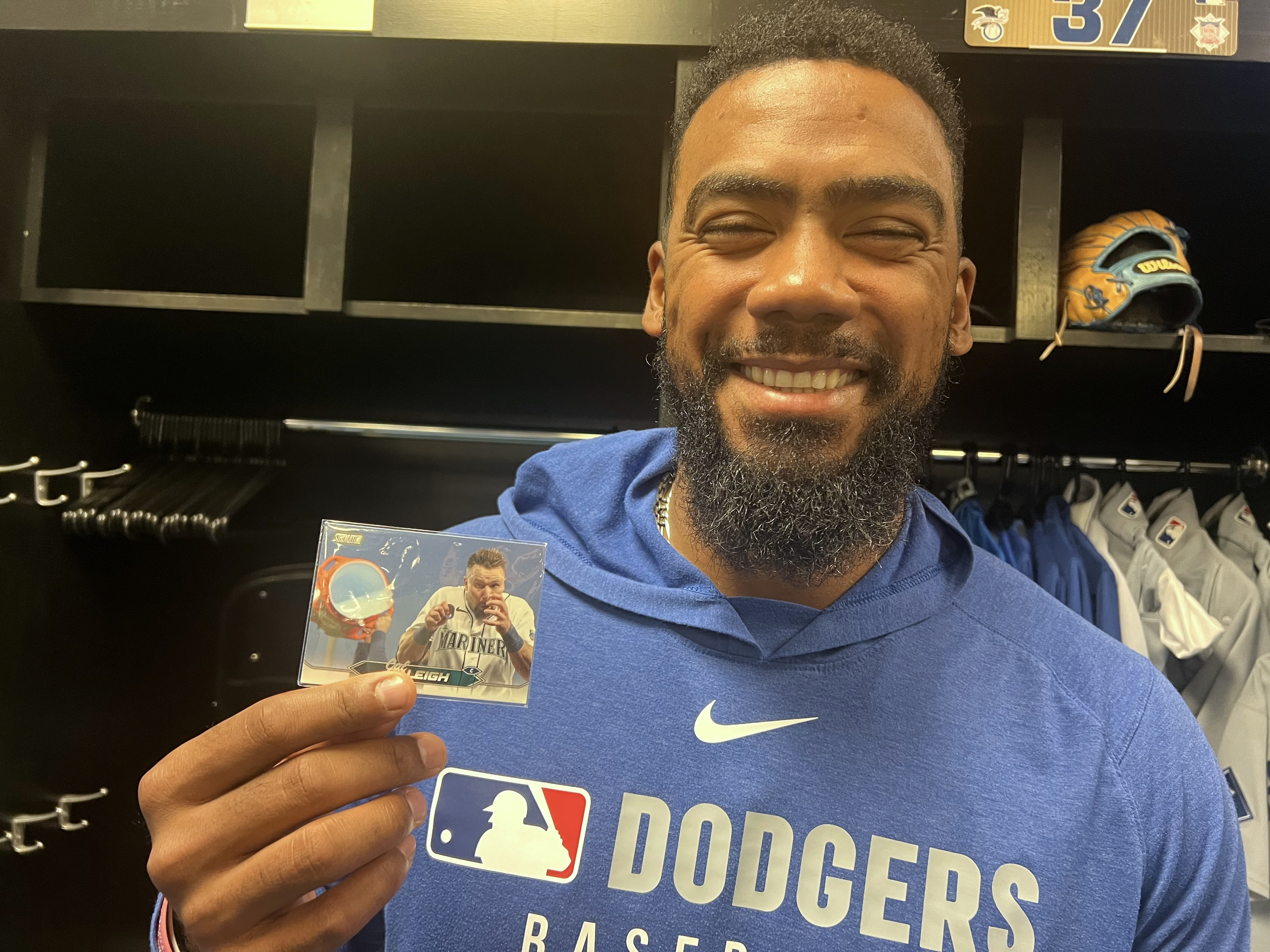 Hernández liked that Raleigh’s baseball card captures the anticipation of the ice shower, giving fans a glimpse of the moment before the moment.