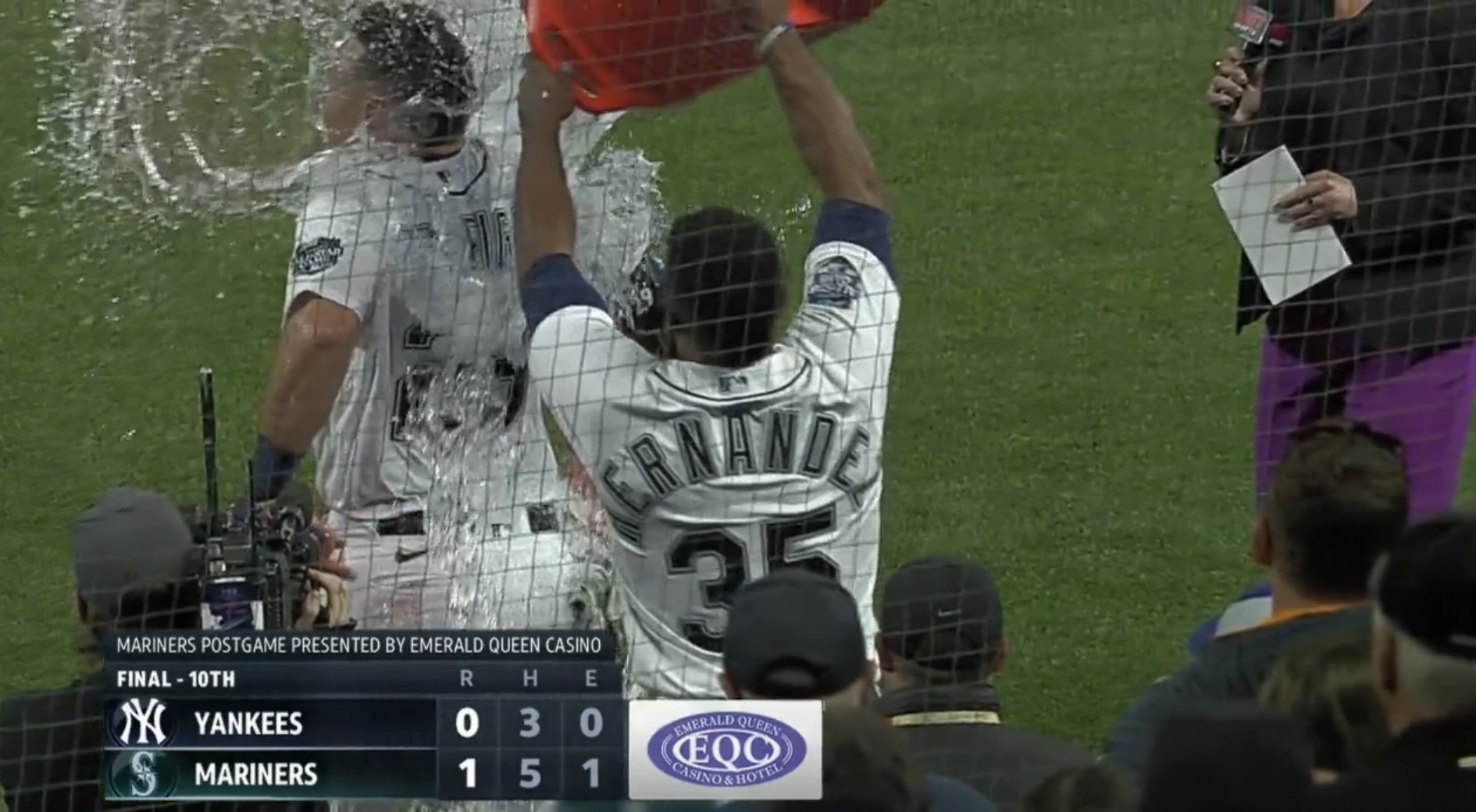 Murphy grabbed a jug of ice water and went one way, and outfielder Teoscar Hernández grabbed another jug and went the other. They met near where Raleigh stood during a postgame interview with reporter Jen Mueller.