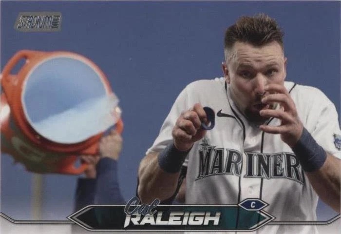 Photographer Steph Chambers captured a postgame slice of the joy that came off Raleigh’s bat, getting a shot of Raleigh about to be drenched with ice-cold water by teammate Tom Murphy. Topps Stadium Club used one of Chambers’ photos for card No. 247.