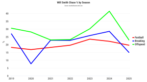 Smith’s chase rate on off-speed stuff was at a career high 41.5% last year, and it has gotten down all the way to 23.1% this year. Just on breaking balls, that number has gone from 28.6% to 15.1%.