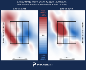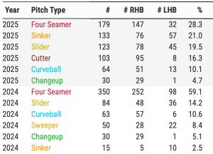 It’s not often we can look at a rookie pitcher and see a marked change in how they’re going about their business. Granted, Justin Wrobleski had a whole off-season to reinvent himself after his call-up and brief stint in the majors in 2024. He made the most of it, though. He was decidedly one-note with some interesting traits, but not much else to speak of last year. Let’s go over what he was doing then before we dive into why things are so much better for him now.