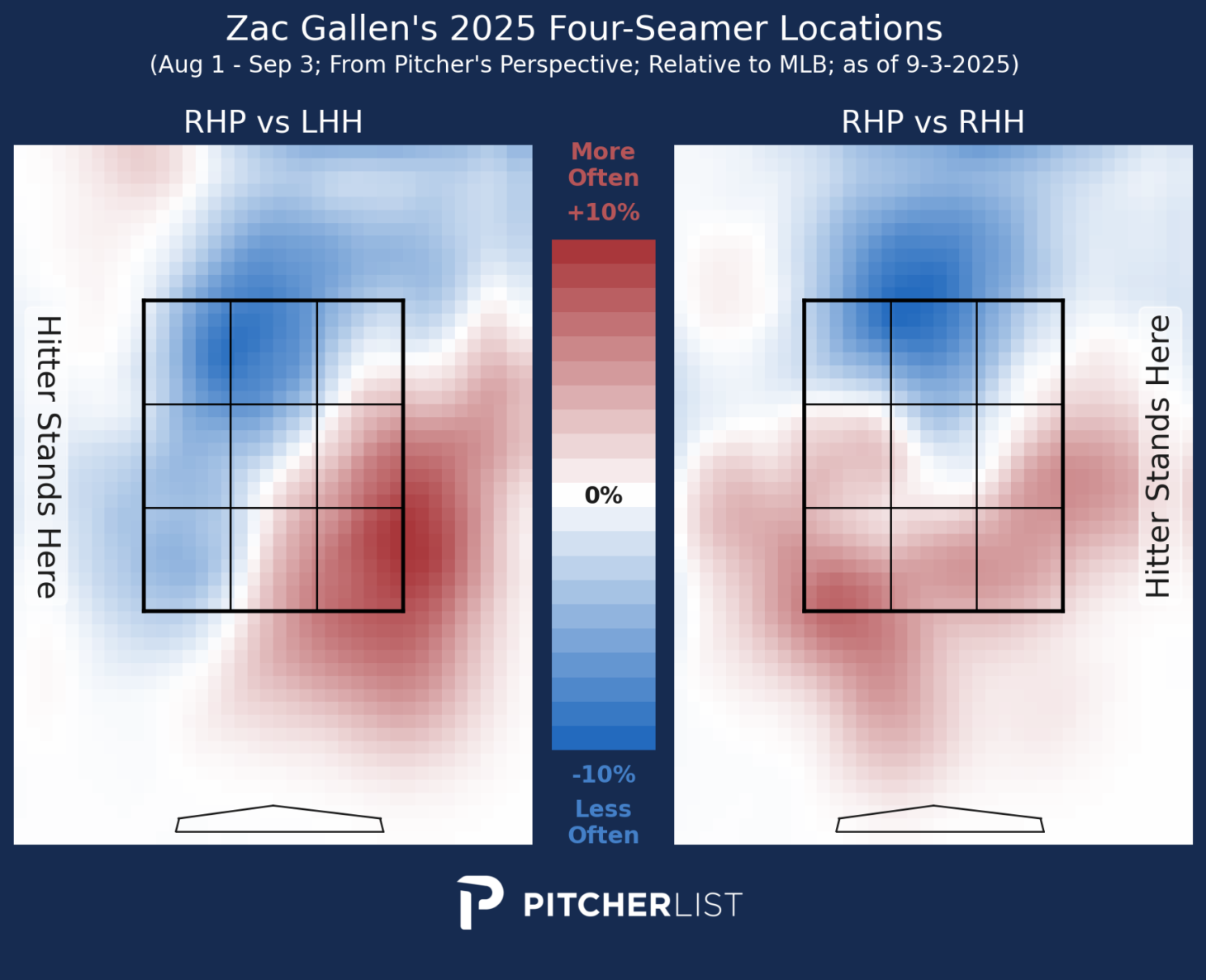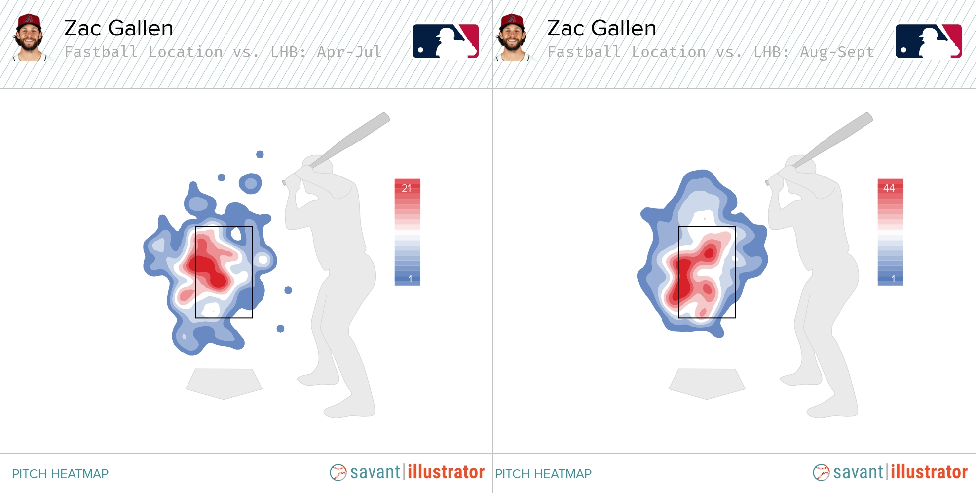 Compared to the earlier months, Gallen has moved away from the up-and-in spot while taking his fastball slightly more off the plate away against lefties. Against righties, he’s throwing his fastball more down-and-away. The result is a 10% improvement in plvLoc+ 105 plvLoc+, now above-average.