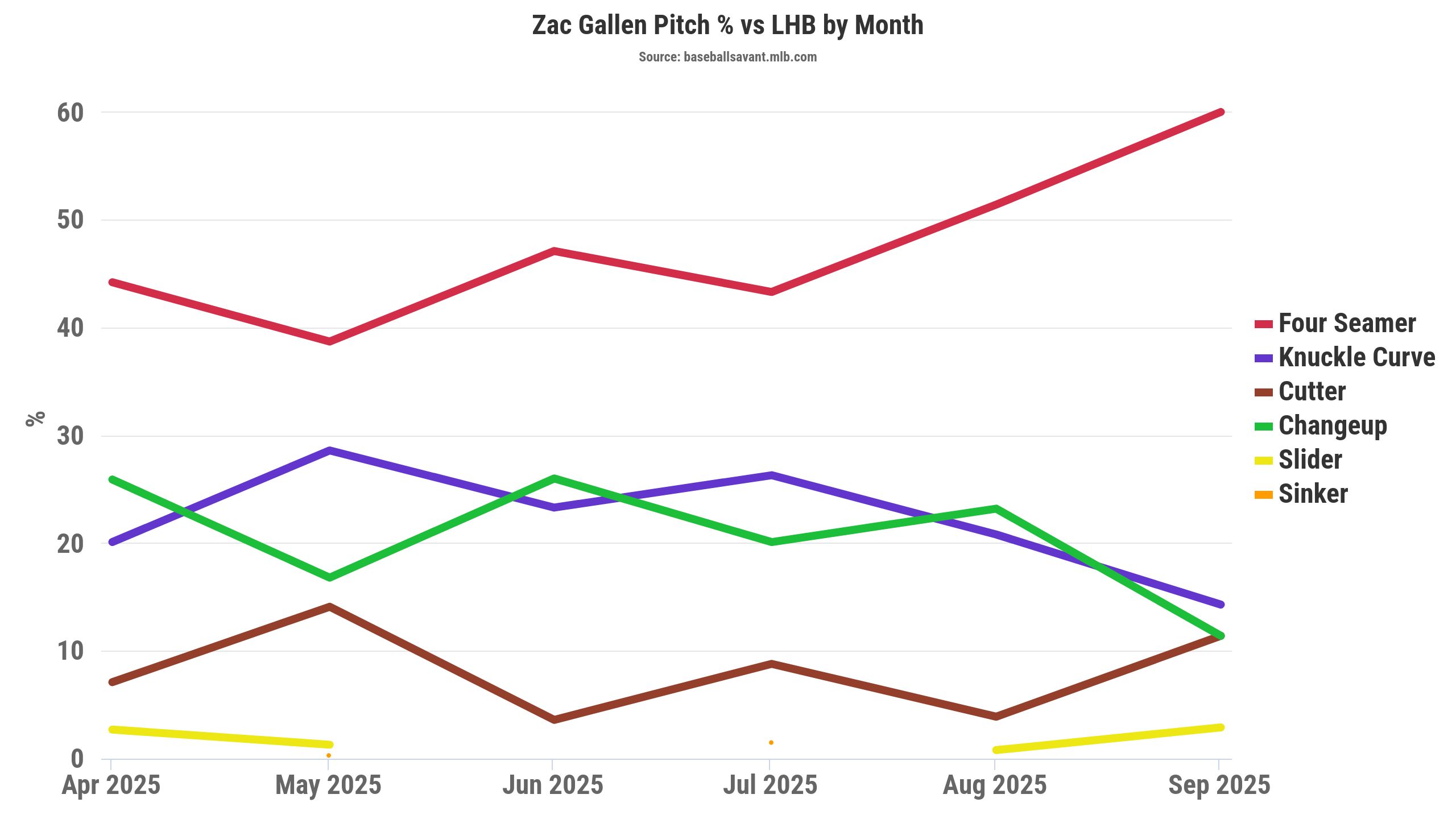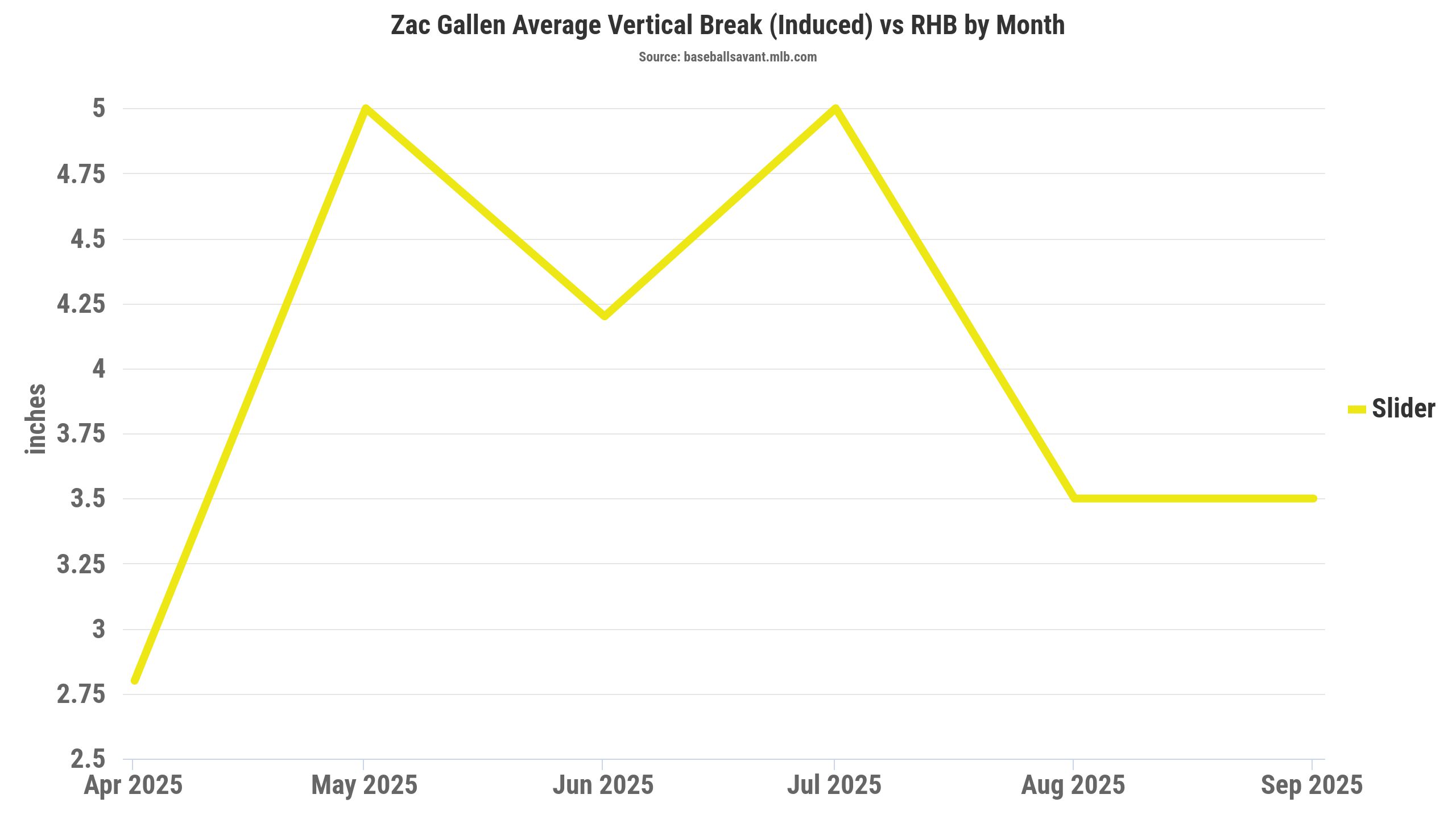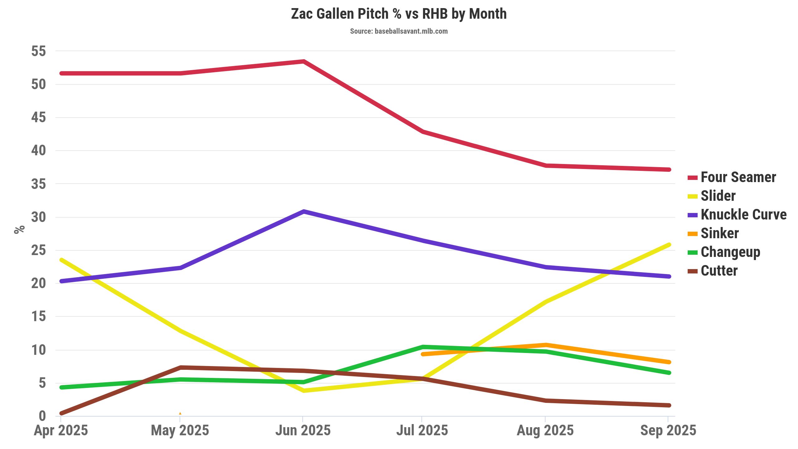 The other significant trend for Gallen (as you may have noticed on the chart) is the return of the slider. Gallen started 2025 with the slider at 23.5% usage, far greater than any previous usage against righties. After the first month, he progressively scrapped it until he recently increased the usage.